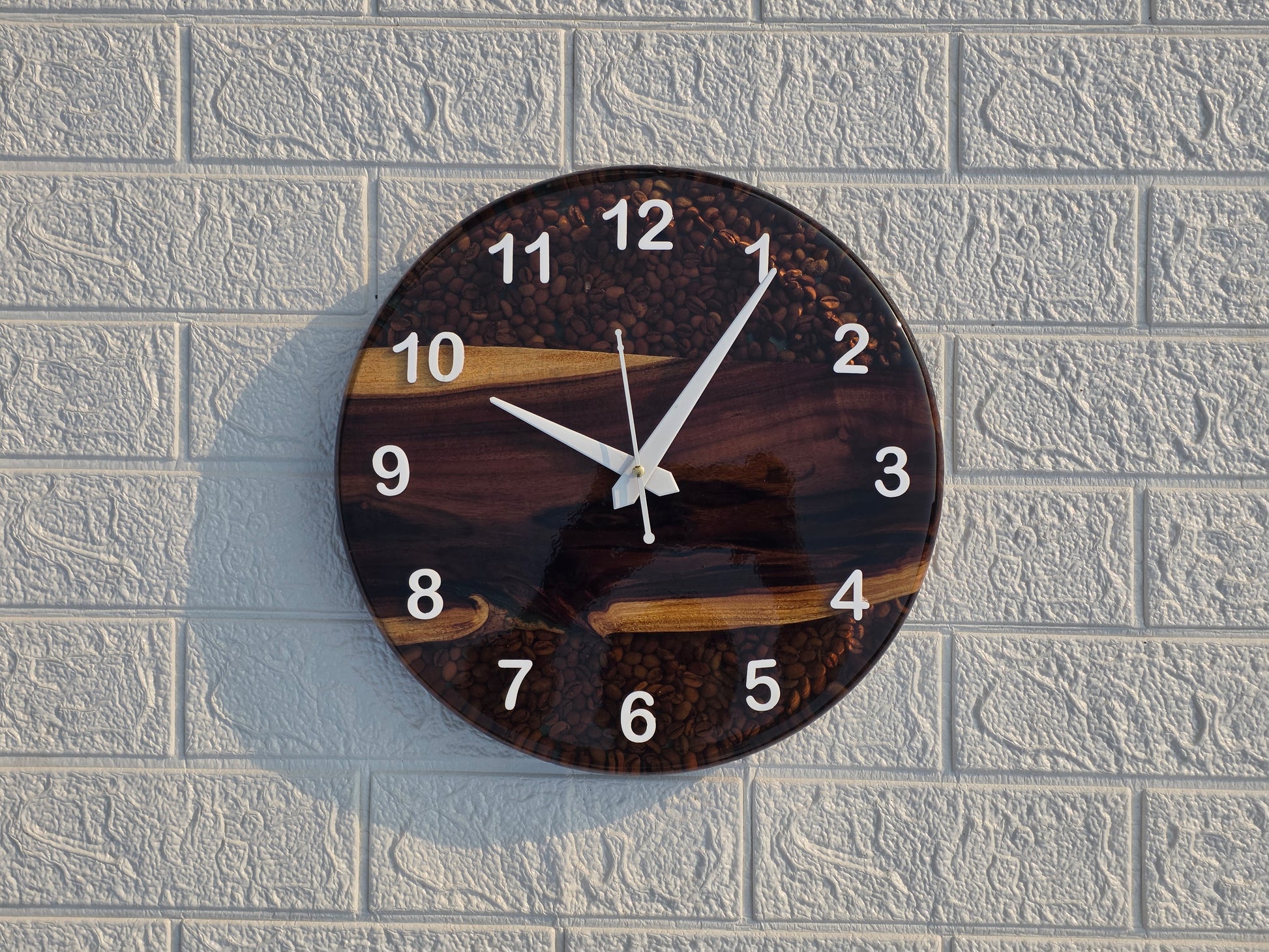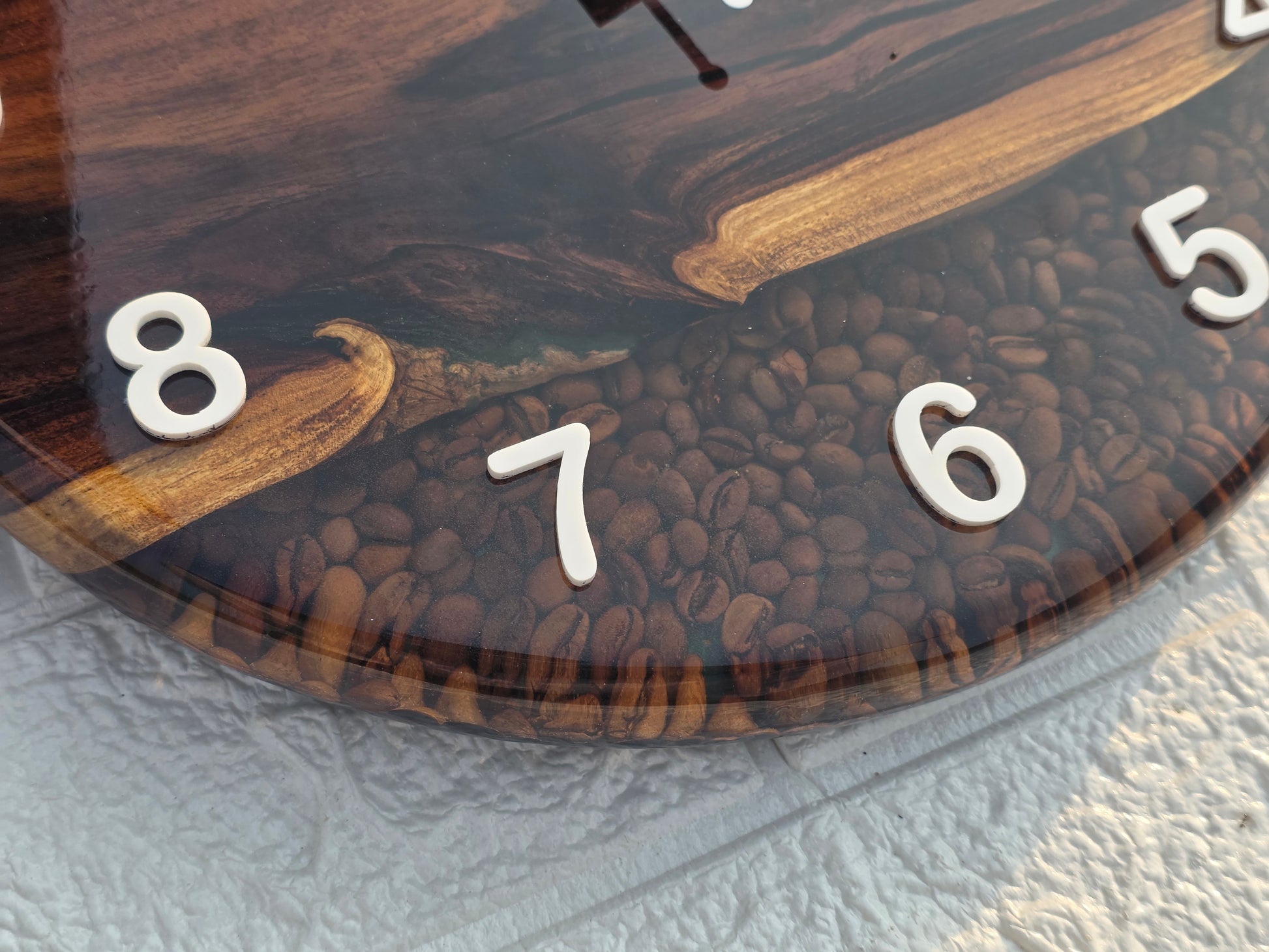 Coffee Beans Epoxy Clock| Woods And Knots as part of our collection was custom made. There will be a 10% change to the color of the wood and resin. The WoodsAndKnots team will finalize the tiniest of details with you.