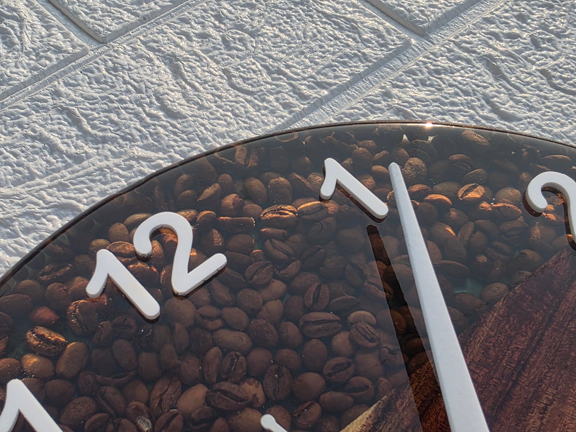 This artisanal epoxy clock merges functional design with aesthetic appeal, featuring genuine coffee beans encased in premium resin. The transparent resin matrix showcases the organic texture and rich tones of carefully selected beans, creating visual depth and sophistication. Engineered with a reliable quartz movement mechanism for accurate timekeeping without audible ticking. The polished resin surface resists dust and moisture, ensuring longevity and minimal maintenance. Perfect for coffee aficionados seeking a statement piece that reflects both passion and refined taste in home or office environments.