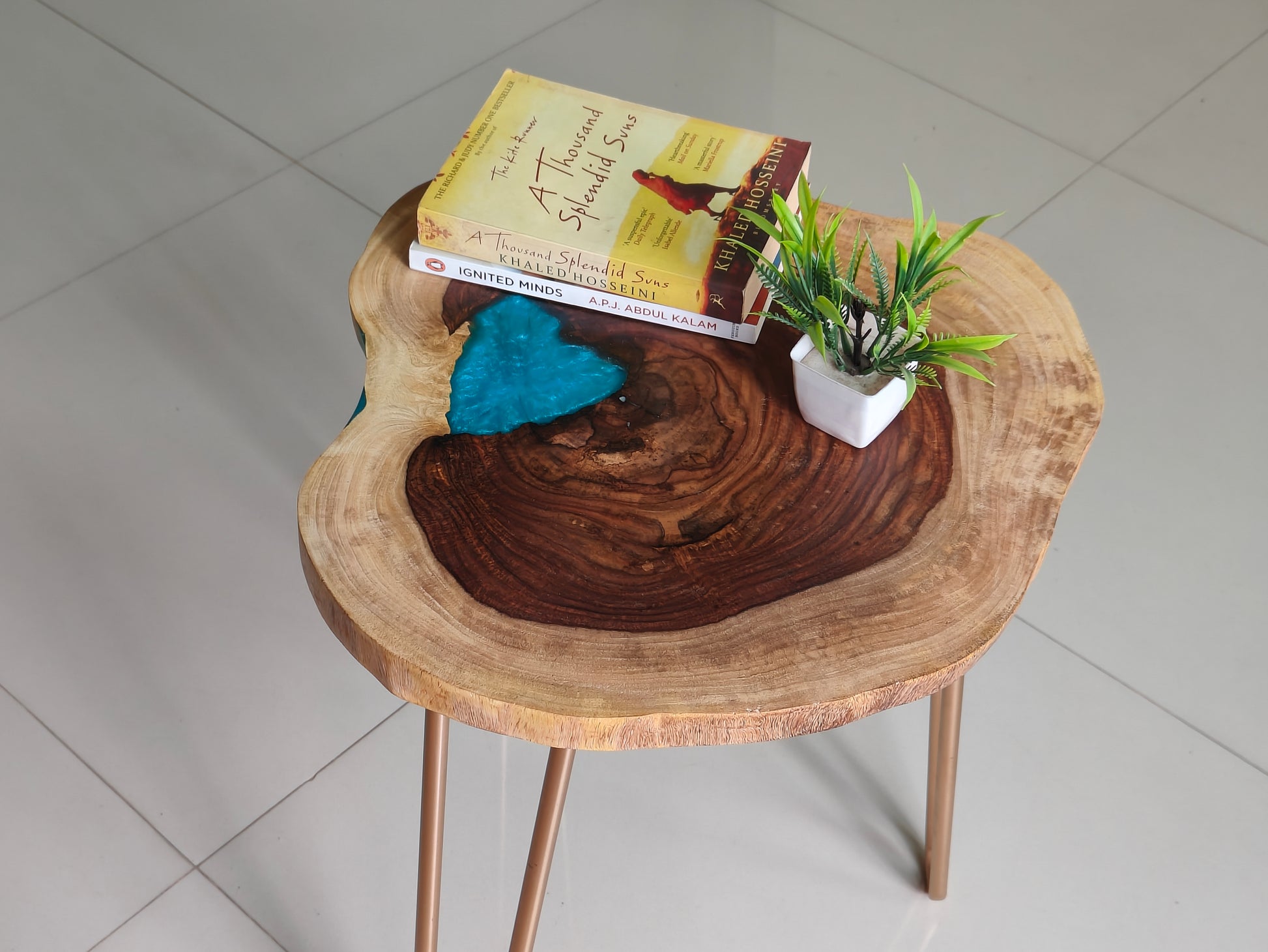 Cookie Slab Side Table as part of our collection was custom made. There will be a 10% change to the color of the wood and resin. The WoodsAndKnots team will finalize the tiniest of details with you.