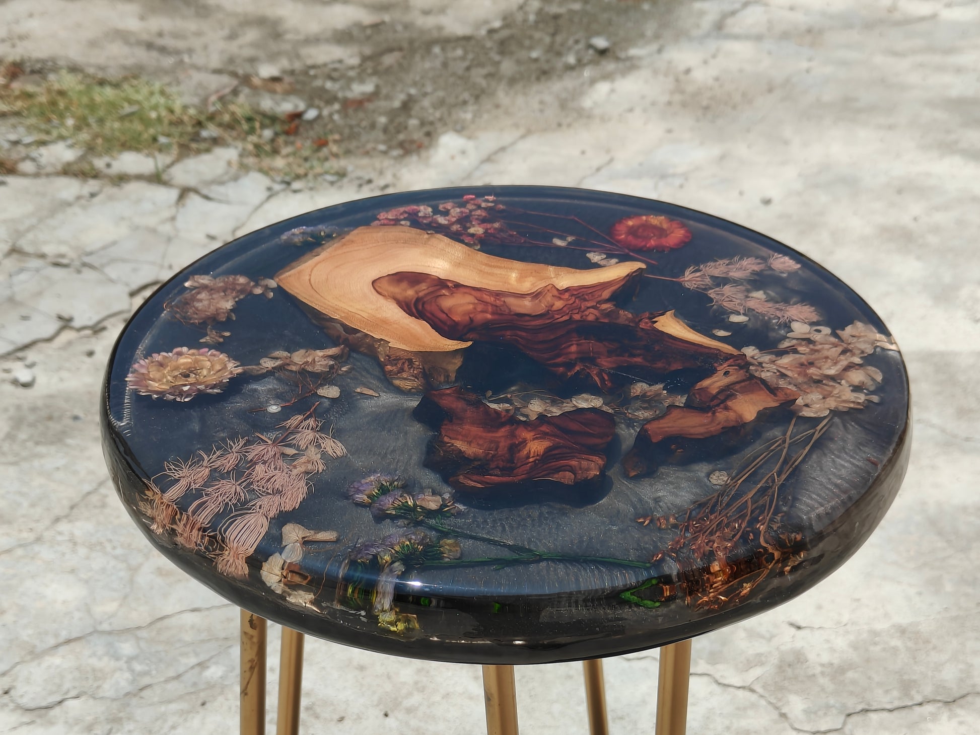 I recently purchased this epoxy flower side table, and it has quickly become one of my favorite pieces of furniture. This stool-like side table is small yet mighty in its ability to transform a space. The wooden base gives it a warm and natural feel, while the embedded flowers encased in the shiny epoxy top add a unique and artistic touch.